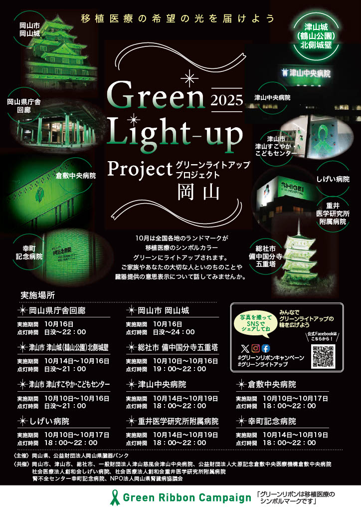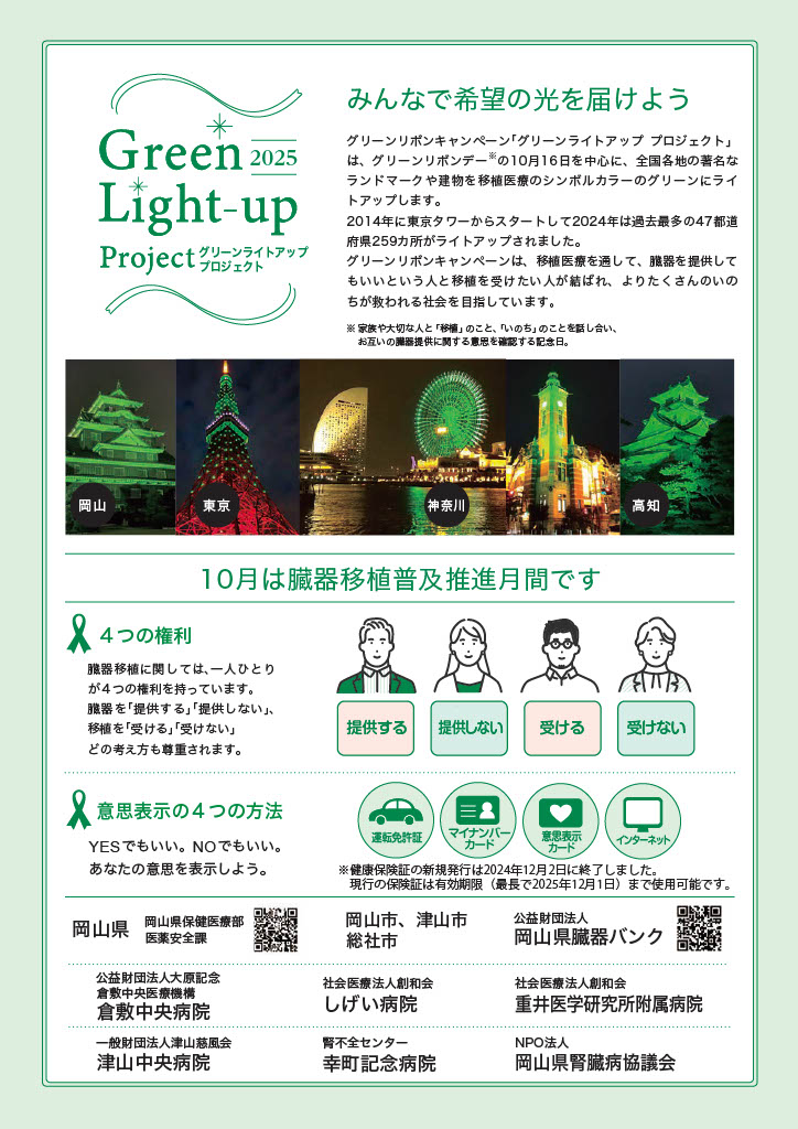 10月の臓器移植普及推進月間に因み、今年は11日から21日まで県内9ヶ所がグリーンに輝きます。お楽しみに。