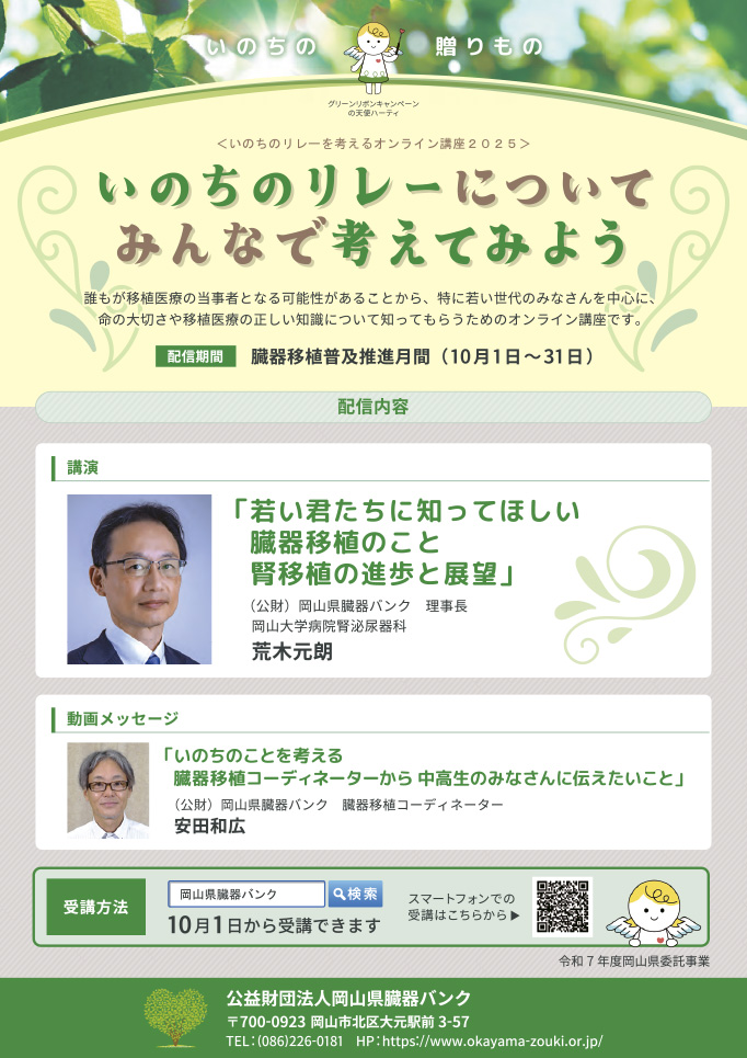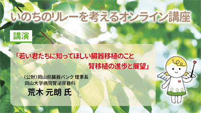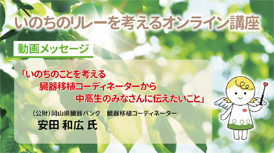 誰もが当事者となる可能性がある臓器移植について、特に若い世代を対象に臓器提供・臓器移植の正しい知識を伝え、いのちをつなぐことの大切さを考えていただくためのオンライン講座です。